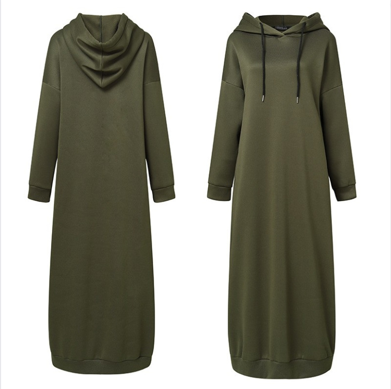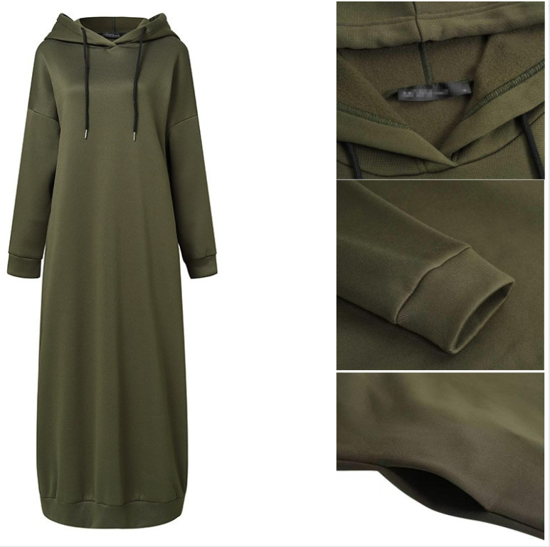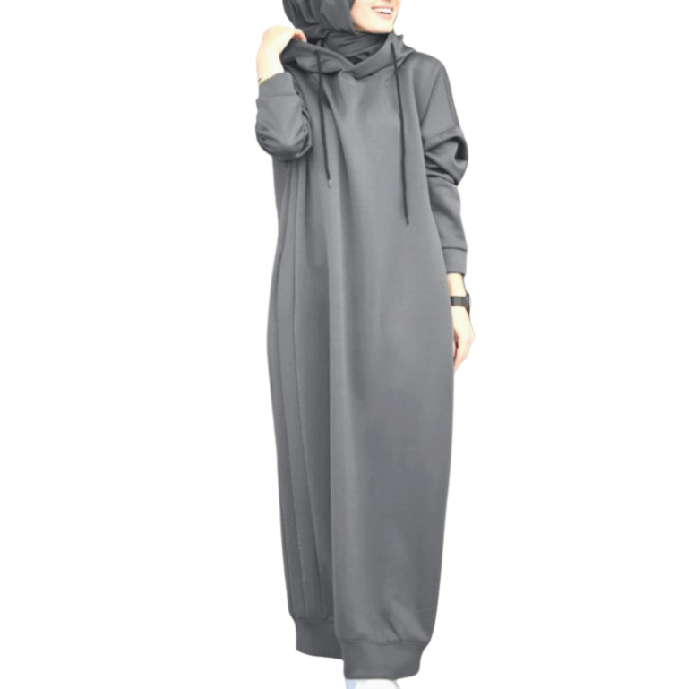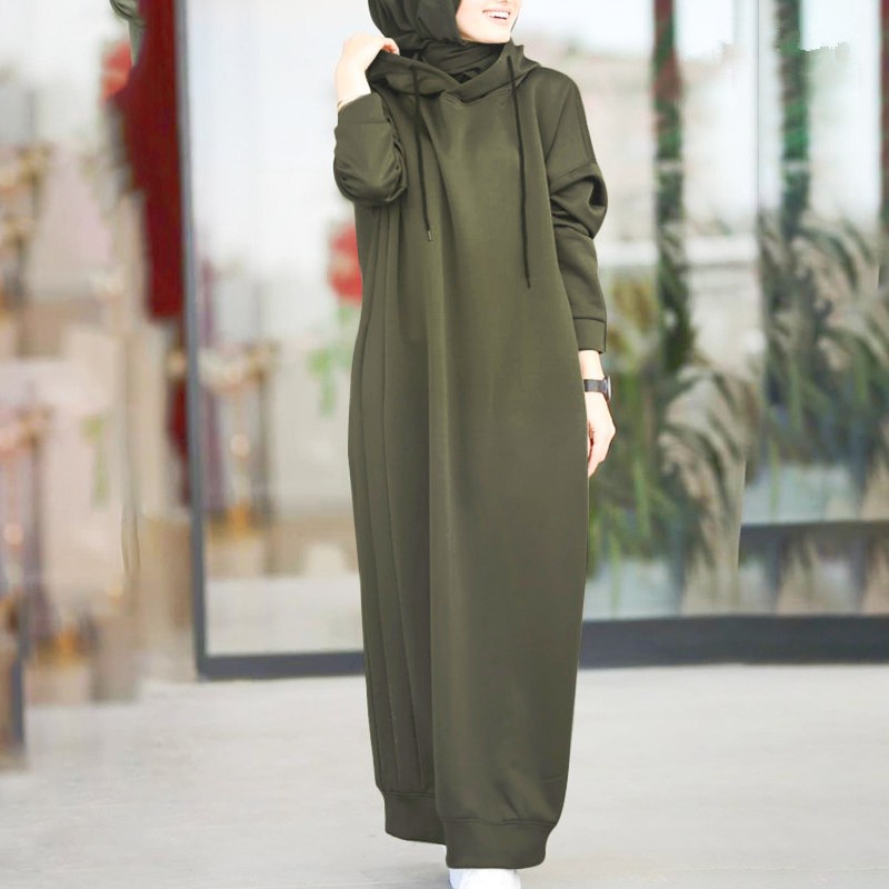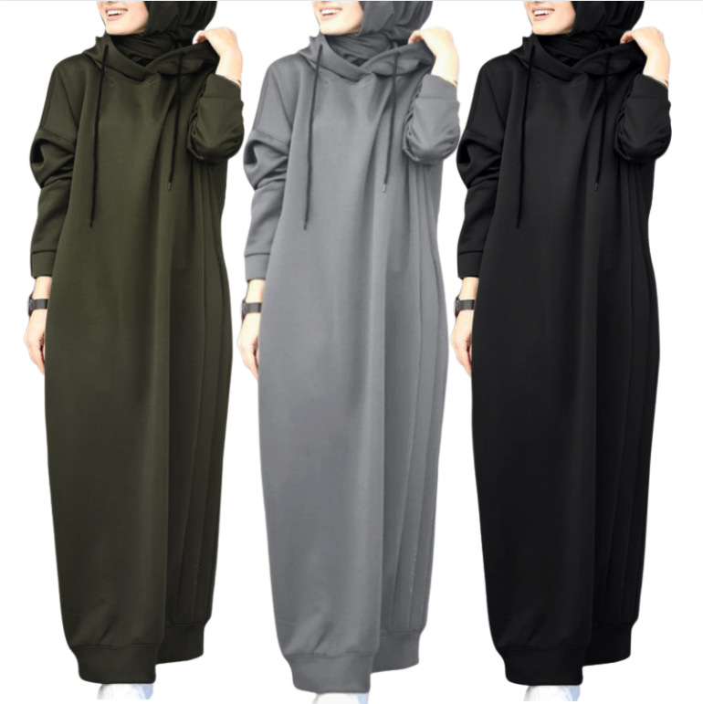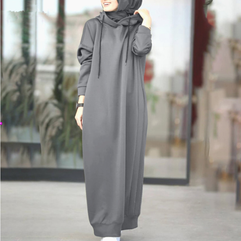 Women's Muslim Autumn And Winter Solid Color Hooded Drawstring Loose Casual Pocket Long Sleeve Long Hoodie Dress